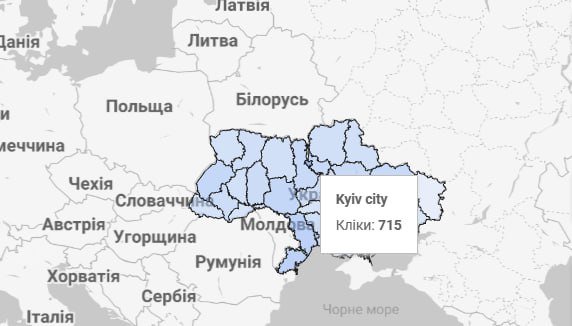 Ми адаптували рекламу під користувачів з різних регіонів, а Київ став основним джерелом кліків — 715 переходів лише з міста. Це дозволило точніше працювати з локаційною аналітикою.