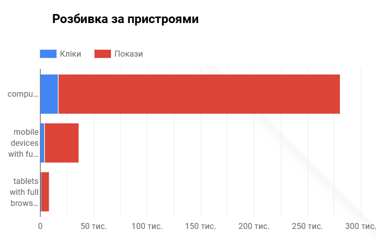 Більшість кліків отримали на комп'ютерах, що нам і потрібно, адже це більш цільова аудиторія.