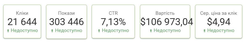Дані зібрані з акаунту за майже рік роботи: 106 тисяч доларів бюджету і 21 644 кліків з ціною за клік — 4,94 долара, що для такої ніші дуже чудово. Запуск 24.05.2024